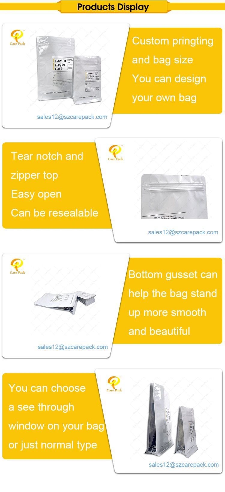 Custom Coffee Bean Snack Pet Dog Cat Food Flat Bottom Glossy Eight Side sealed Bag with Easy Tear Zipper and clear Side Gusset