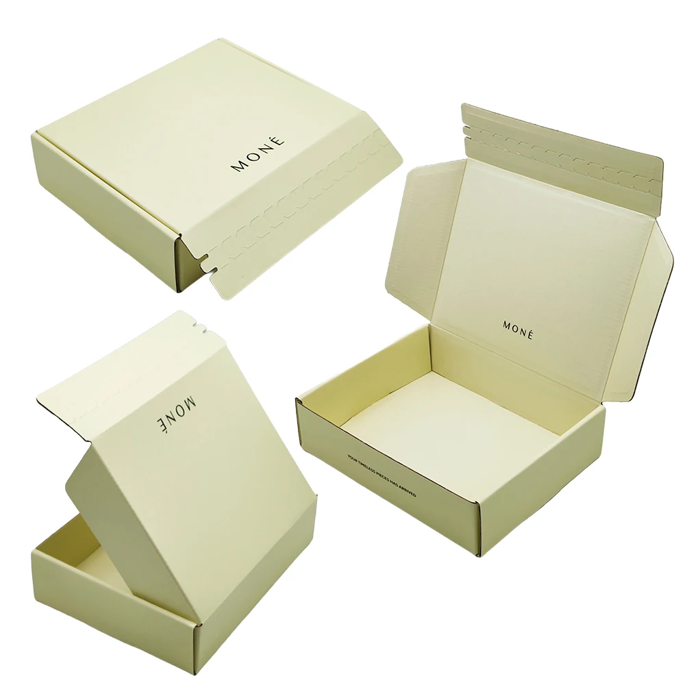 Custom Self Seal Adhesive Packaging Corrugated Matte Soft Touch Film Cream Yellow Zipper Tear Strip Mailer Boxes Shipping Boxes