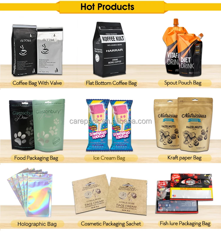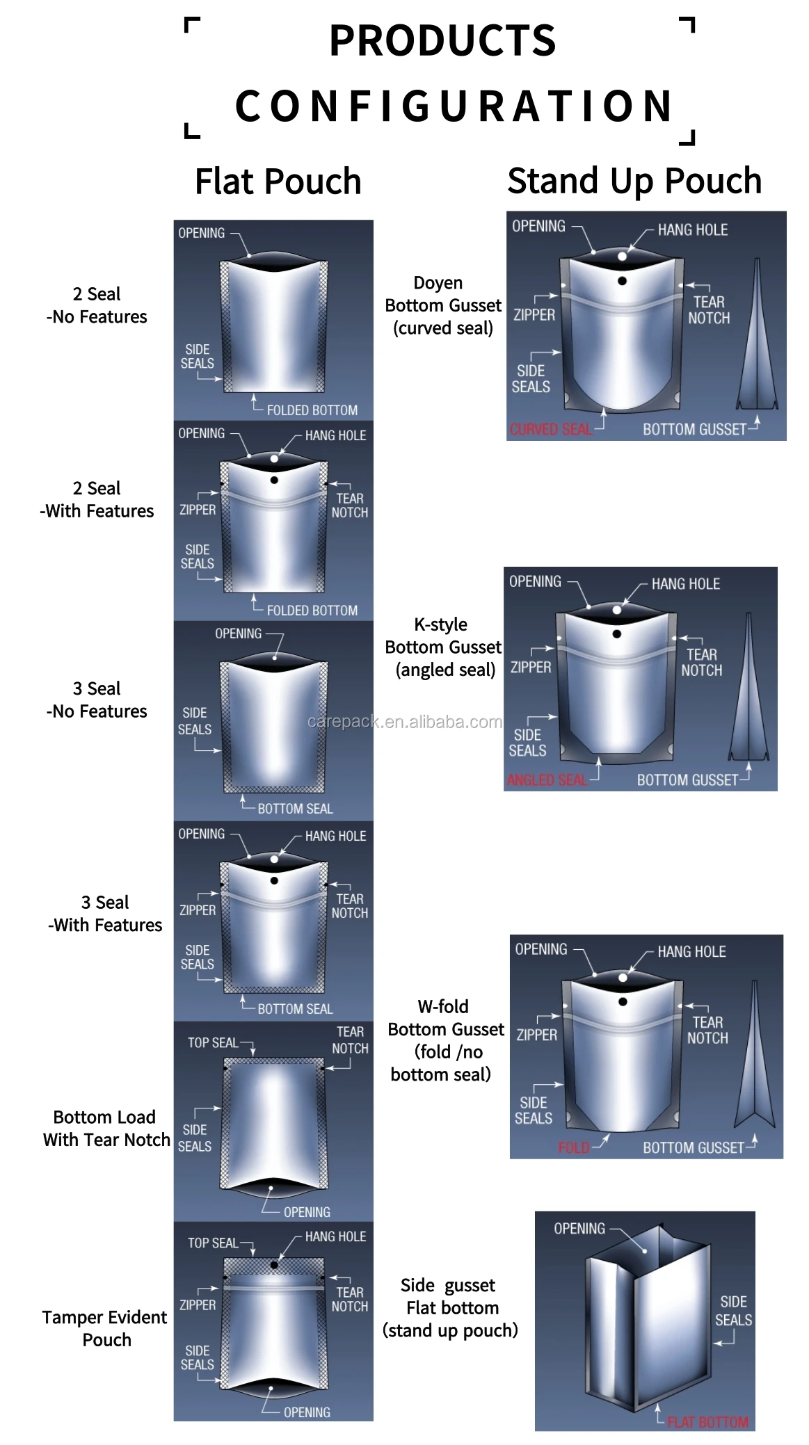 1. Glossy: PET/VMPET/PE, PET/AL/PE, OPP/AL/CPP, OPP/VMPET/CPP, PET/PE 2. Matt: MOPP/VMPET/PE, MOPP/PE, NY/PE, NY/CPP 3. Kraft paper 4. Food grade material or customized |