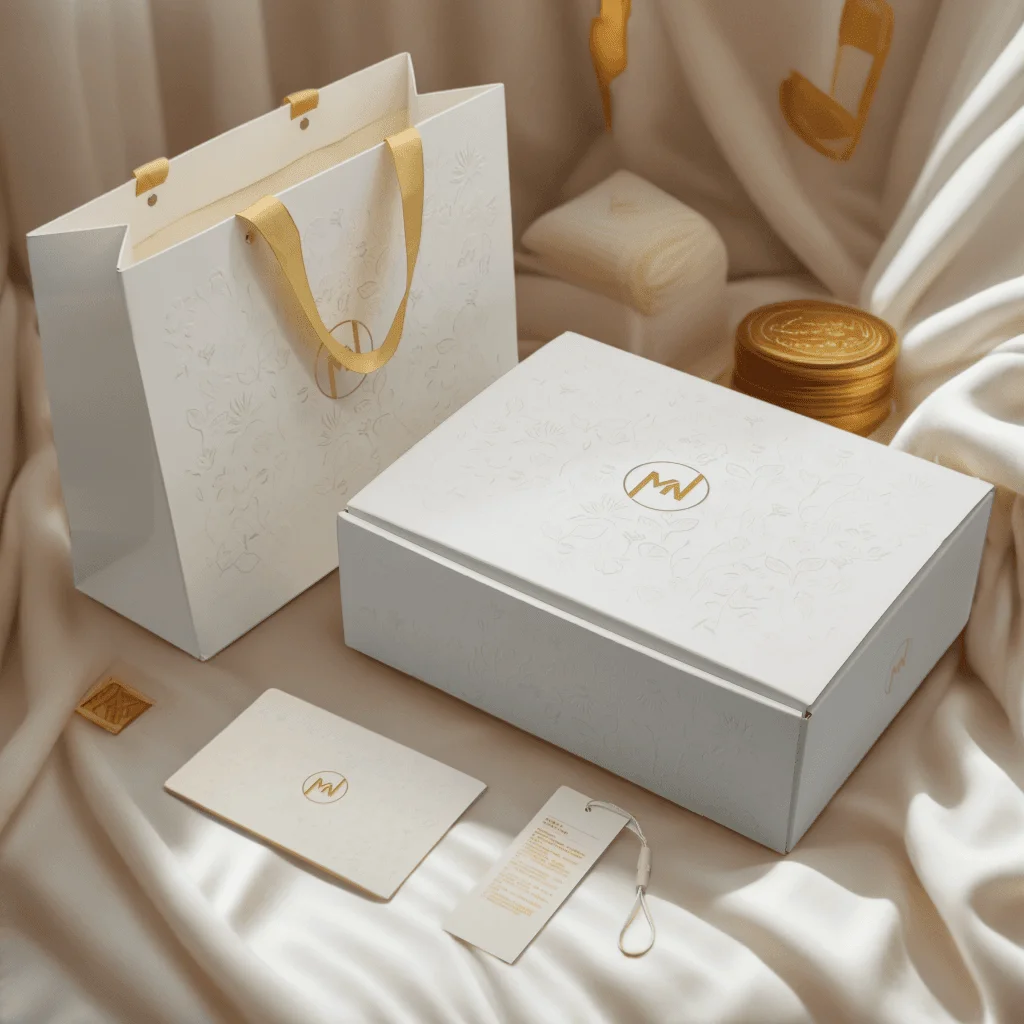 paper box + paper bag + tissue papper + mailer bag + stick label + paper card