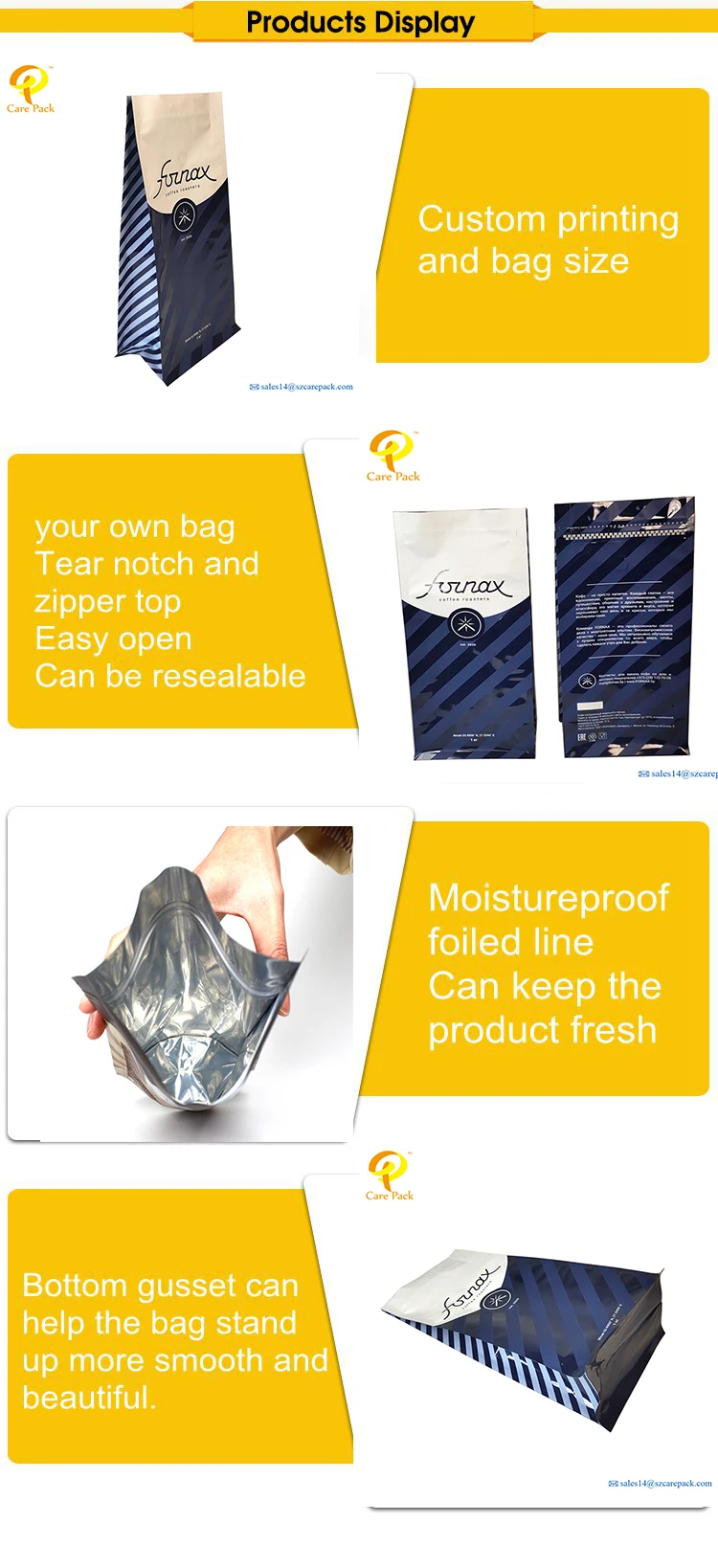 1. Glossy: PET/VMPET/PE, PET/AL/PE, OPP/AL/CPP, OPP/VMPET/CPP, PET/PE 2. Matt: MOPP/VMPET/PE, MOPP/PE, NY/PE, NY/CPP 3. Kraft paper 4. Food grade material or customized |