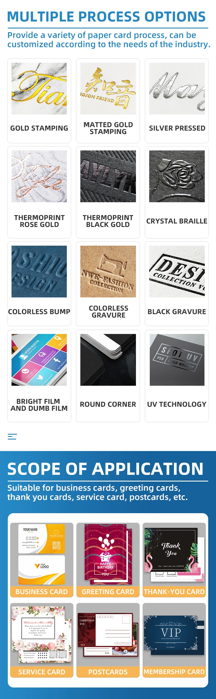 gold stamping , matted gold stamping , silver pressed, thermoprint rose gold , thermoprint black gold , crystal braille,colorless bump , colorless gravure, black gravure, bright film and dumb film, round corner, uv technology